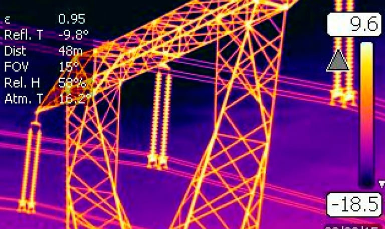 Realizamos inspecciones seguras y eficientes de líneas eléctricas, utilizando cámaras térmicas para identificar posibles puntos calientes y prevenir fallos antes de que ocurran.